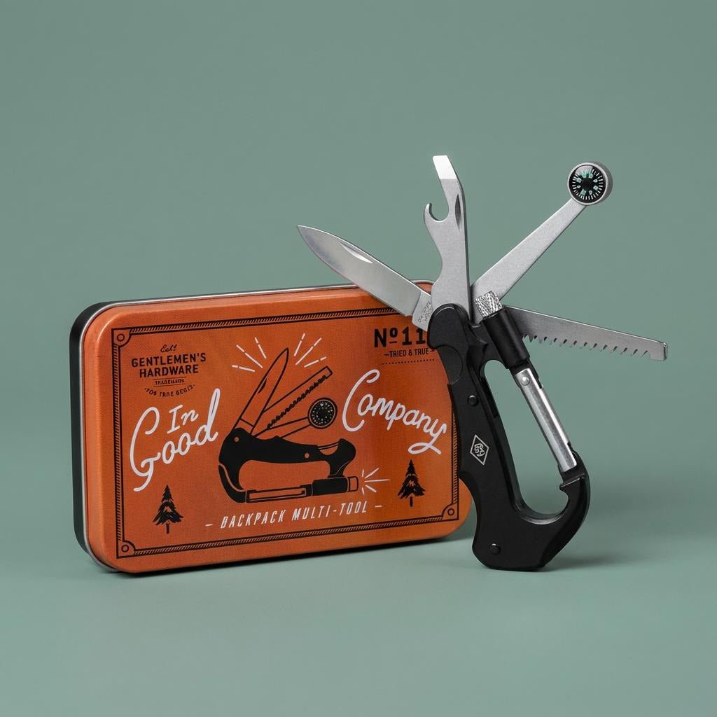 The Gentlemen’s Hardware carabiner toolset is designed for people who like practical kit that actually earns its place. Clip it to your rucksack, belt, or keys and it is always ready. The compact design hides a set of genuinely useful tools for camping, travel, DIY jobs, and everyday fixes. Built from durable materials, it feels sturdy rather than gimmicky. The carabiner shape keeps it secure while still quick to access. Whether you are tightening something, opening something, or solving a small problem on the go, it delivers quiet reliability. A simple, well made piece of gear that suits life outdoors and in.